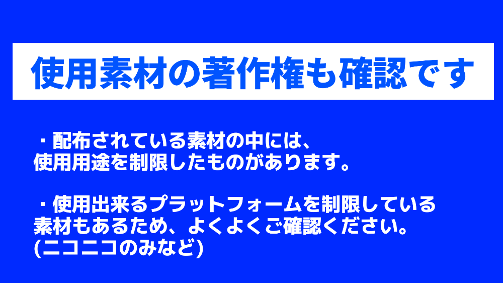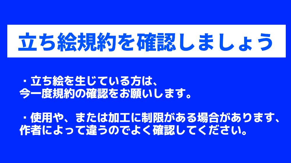 ③曲や立ち絵、使用素材の著作権や利用規約は必ず守るようお願いします。違反した際は自己責任でお願いします。